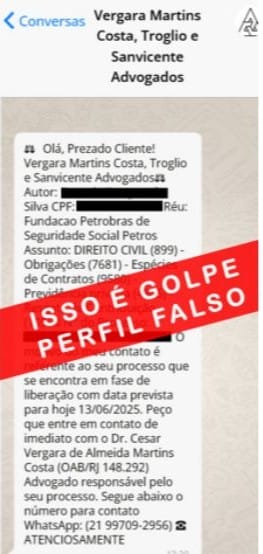 Mais uma vez, estelionatários estão se fazendo passar por representantes do nosso escritório na tentativa de aplicar golpe e conseguir somas de dinheiro. Solicitamos que não forneçam dado algum e se comuniquem diretamente com o nosso escritório, agendando atendimento pessoal se necessário.