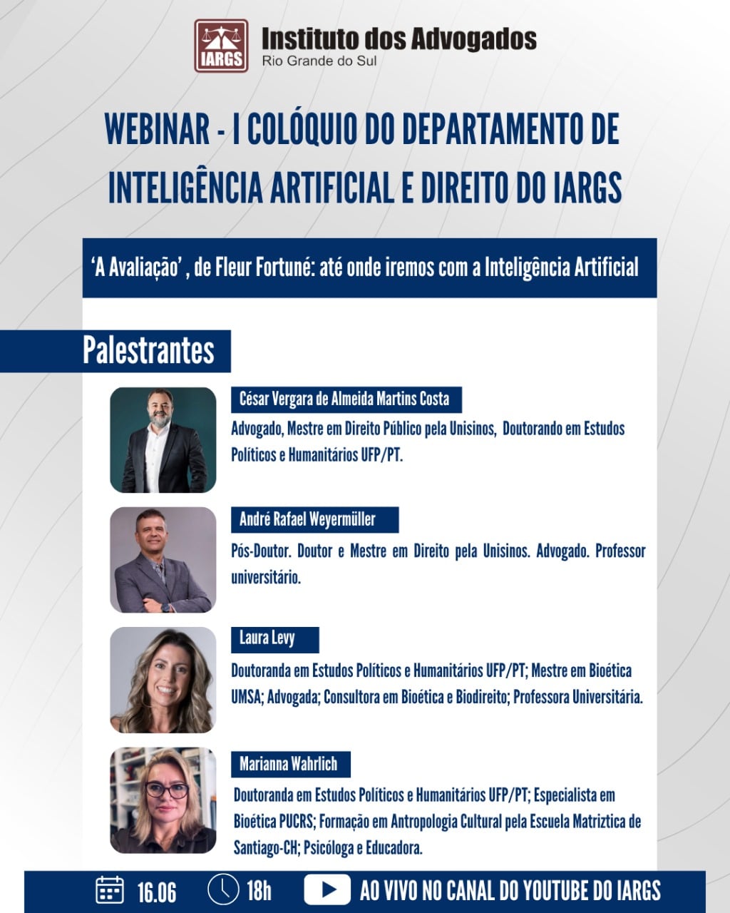 O Instituto dos Advogados do Rio Grande do Sul (IARGS) realiza, no próximo dia 16 de junho, às 18h, o Webinar – I Colóquio do Departamento de Inteligência Artificial e Direito, com o tema “A Avaliação”, de Fleur Fortuné: até onde iremos com a Inteligência Artificial. O evento será transmitido ao vivo pelo canal oficial do IARGS no YouTube.